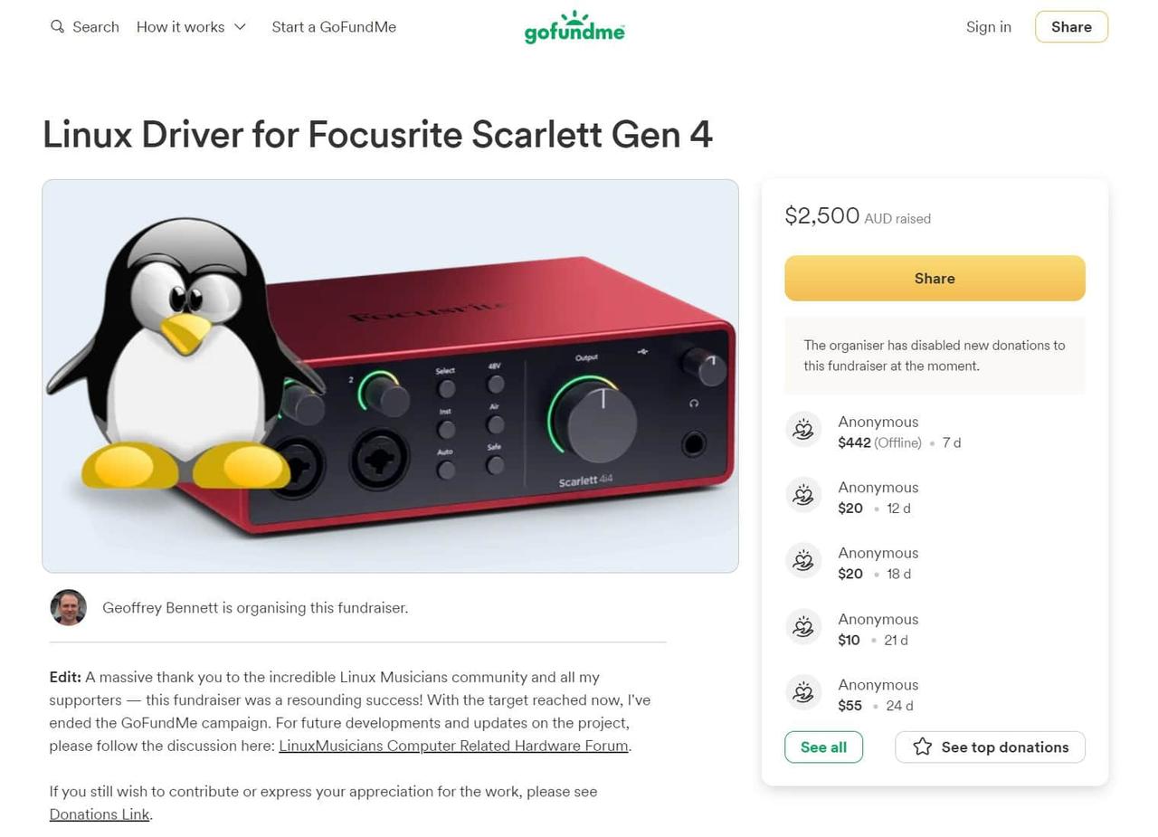 虽然我之前一直很难与 Focusrite 的工程师或管理层取得联系,但这次筹款活动获得热烈反响的消息传到了 Focusrite 的高层。考虑到 Linux 音频的小众性质,我一直控制着自己的期望值,但这超出了我的想象。