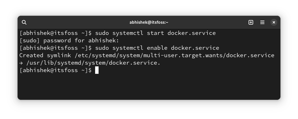 我还建议启用 Docker 服务,以便 Docker 守护进程在系统启动时自动启动。