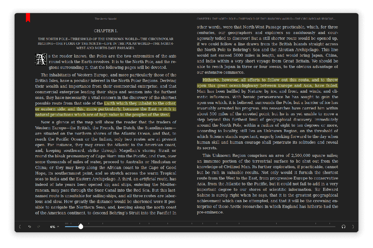在顶部,你可以看到一个方便的搜索栏,让你可以在书中搜索特定的词或句子,同时有一个“ 图书库 ”按钮可以帮助你回到你的电子书库。