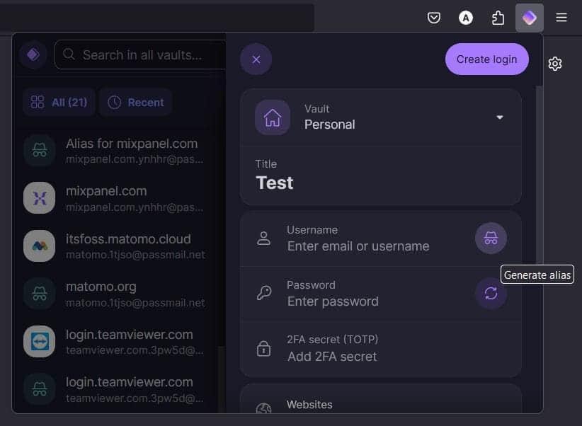 除了所有基本功能外,你还可以在密码管理器内部使用电子邮件别名功能。随着 Proton Pass 的多样性,我们也提供了一个深入的 Proton Pass 和 Bitwarden 的比较。