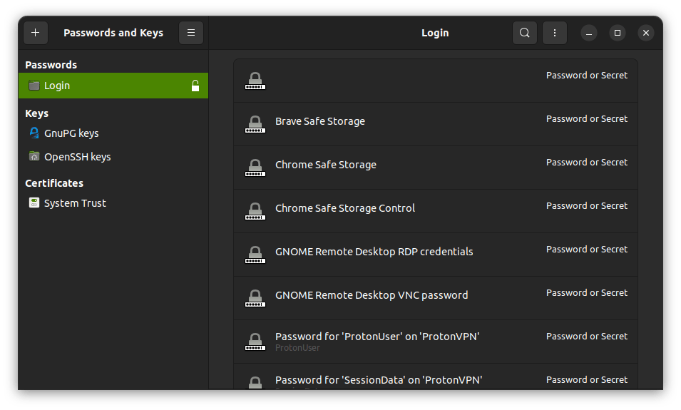 Seahorse 是 GNOME 发展出的一个实用工具,能存储密码并管理加密密钥。与 KWallet 类似,它是一款专为 Linux 设计的应用程序,与 Ubuntu 和其他几种发行版一起预装。