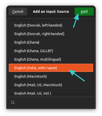 例如,当我单击**英语(印度)时,它会向我显示从丹麦到加纳等的一些英语键盘布局。在这里,我选择了英语(印度,卢比)**键盘。这是将要添加的键盘布局。