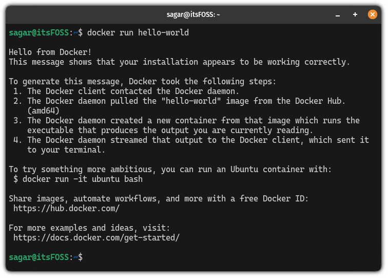 就是这样!从现在开始,你可以使用 docker 命令而不需要 sudo,就像我运行 Docker Hello World 镜像一样: